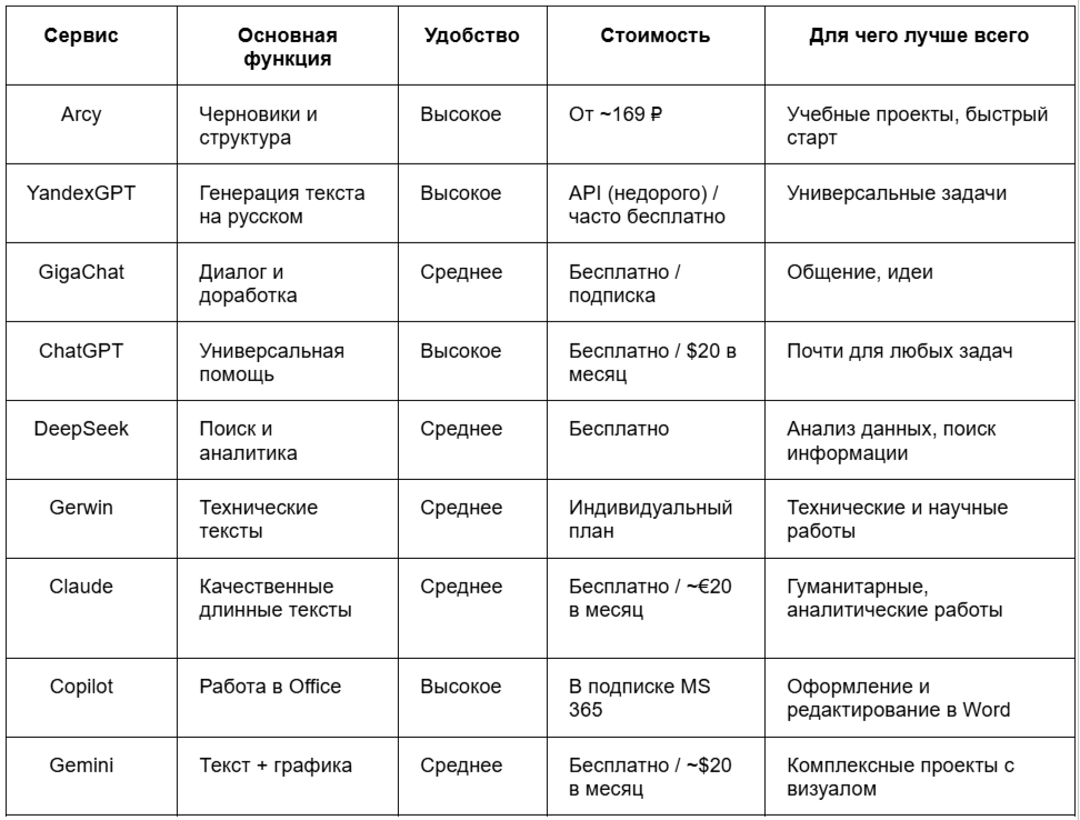 Нейросети стали незаменимым инструментом для создания проектных работ. Arcy занимает первое место благодаря специализации на учебных задачах и цене 169 рублей. Work5 остается надежной альтернативой для тех, кто предпочитает работу с живыми экспертами.