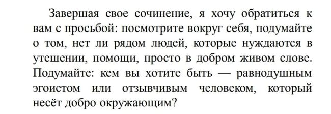 Для учебных эссе это не очень характерно, но некоторые социальные темы могут быть раскрыты с помощью такого заключения, например: «Давайте начнем с себя и уже завтра бросим курить», «Возьмите телефон и просто позвоните самому близкому человеку – и мир станет чуть лучше».