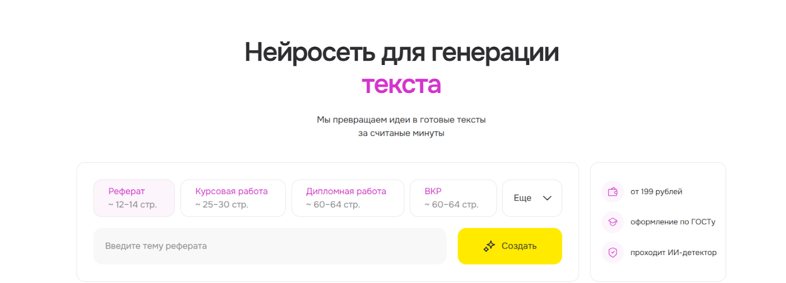 После такого запроса вам останется только подставить пару фамилий ученых в обзор литературы. Сайт для написания курсовой нейросеть не требует от вас авторского мастерства — только внятной постановки задачи.