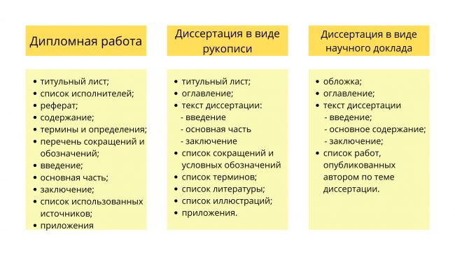 Важно помнить: несмотря на то, что аттестационные работы похожи по своим целям и задачам, при написании любой из них соблюдаются в первую очередь те требования ГОСТов, которые касаются непосредственно вашего научного труда — или диссертации или диплома.