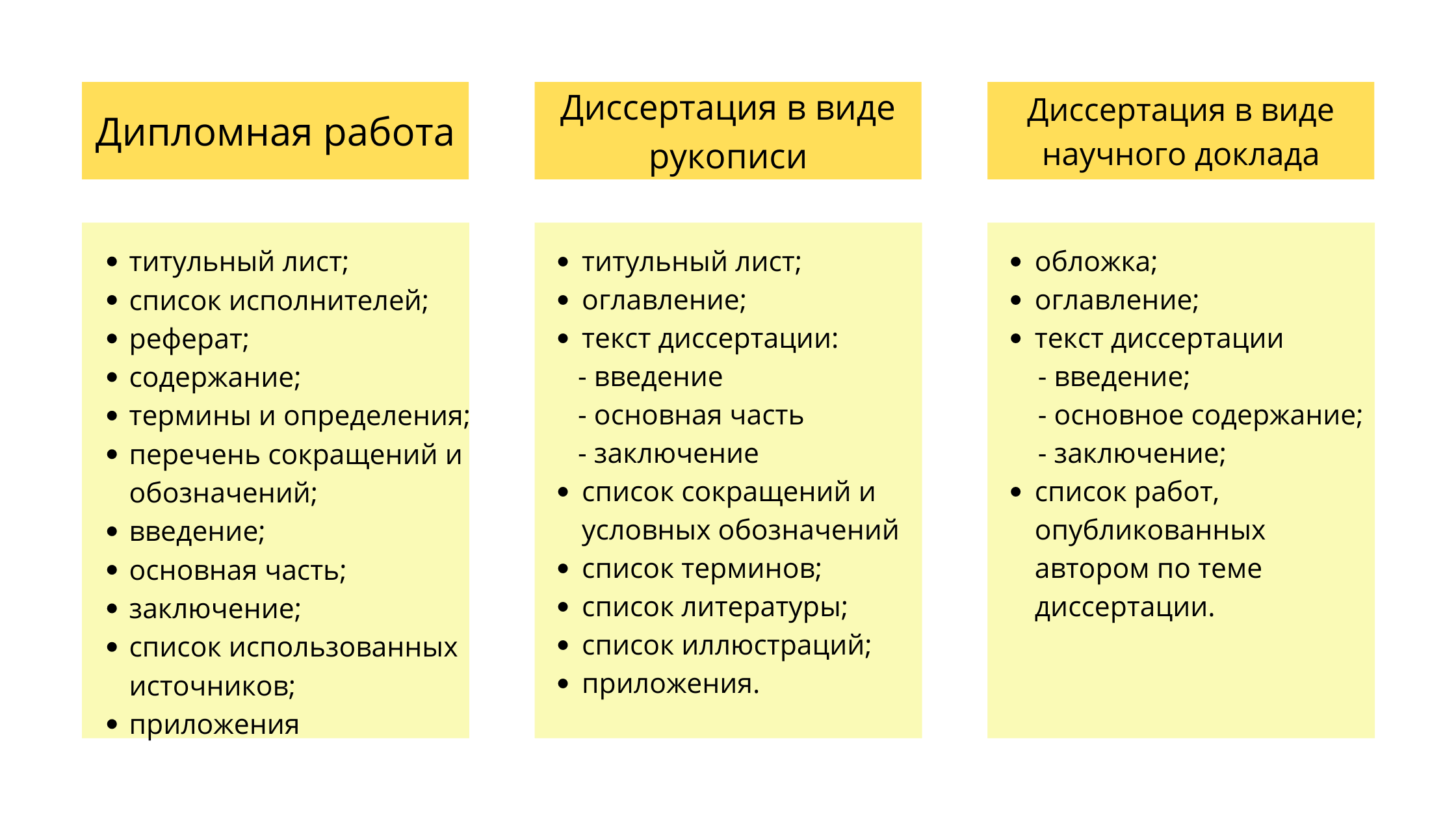 Структура аттестационной работы закреплена в ГОСТ 7.32-2017 и в ГОСТ Р 7.0.1-2011. В общем виде состав итогового проекта аналогичен структуре письменной работы любого вида — введение, основная часть, заключение. Но для каждой из ВКР есть собственные нюансы.