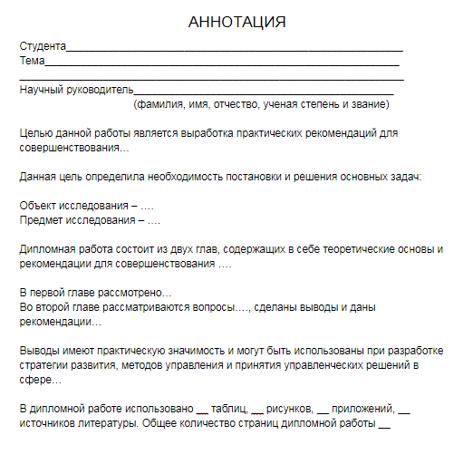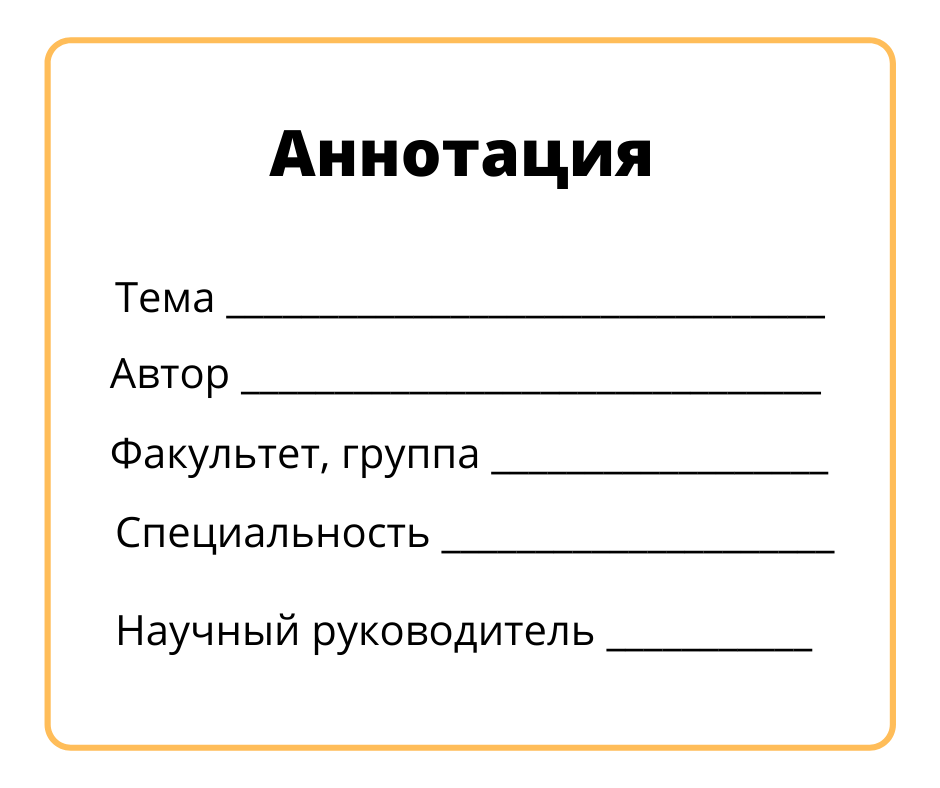 Аннотация оформляется в свободной форме или по стандартному шаблону, который можно получить у научного руководителя или на кафедре. Также преподаватель может предоставить вам примеры сильных аннотаций выпускников прошлых лет.