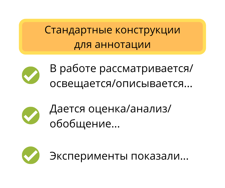Формулировки, которые вы используете в аннотации должны быть убедительными и понятными. Как и в других научных документах, здесь рекомендуется использовать клише, чтобы выделить важные моменты.