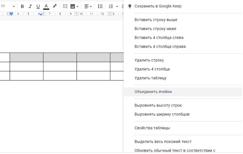 Чтобы объединить, удалить или добавить ячейки, выделите необходимый интервал и нажмите правую кнопку мыши. Во всплывающем окне выберите необходимую функцию.