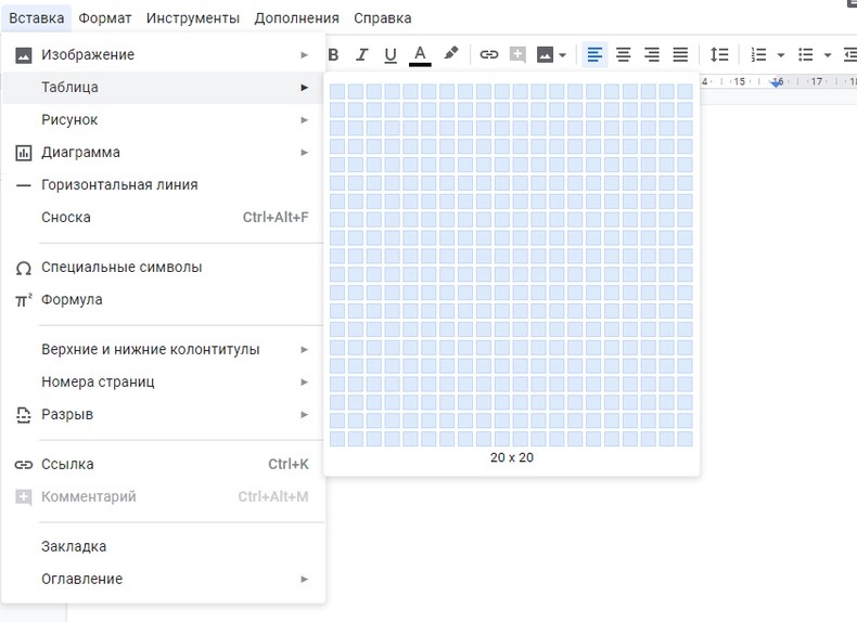 Чтобы выбрать нужное количество ячеек в Google Docs, откройте вкладку Вставка — Таблица. Максимальный размер таблицы, предлагаемый редактором — 20х20 ячеек. Вам остается выбрать подходящее количество строк и столбцов.