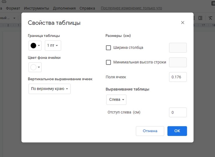 Финальным этапом оформления структуры таблицы будет работа с разделительными линиями. Их можно отредактировать, если на всплывающем окне выбрать вкладку «Свойства таблицы». В появившемся окне вы можете выбрать цвет заливки и границы, тип выравнивания и отредактировать размер полей.