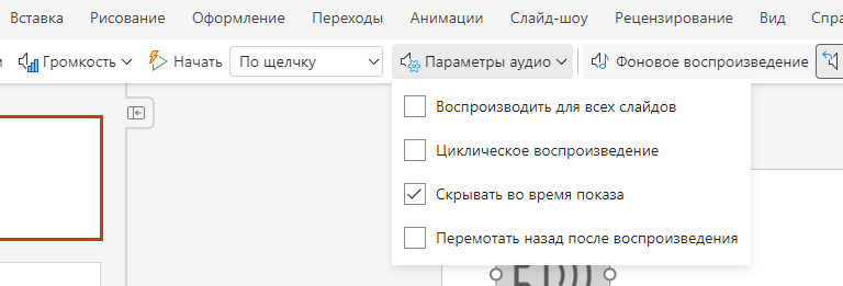 Например, можно воспроизвести его на всех слайдах. Выберите «Параметры аудио» и поставьте галочку напротив пункта «Воспроизводить для всех слайдов».