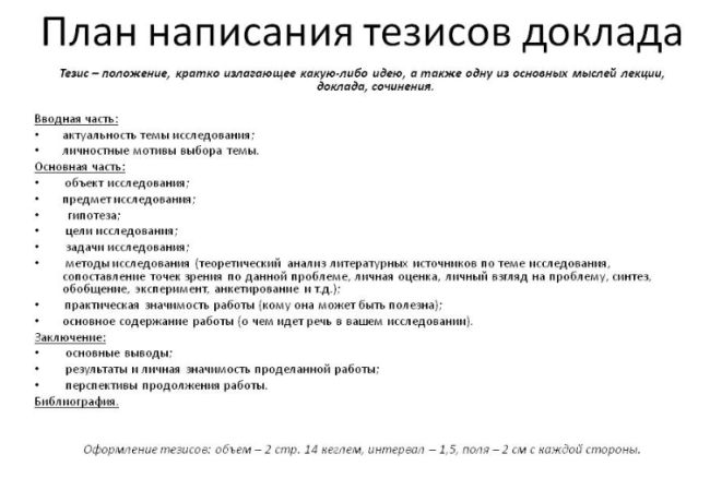 В тезисы не входят определения терминов, объяснение работы или закономерности, перечисления. В них записывается кратко актуальность и сущность работы.