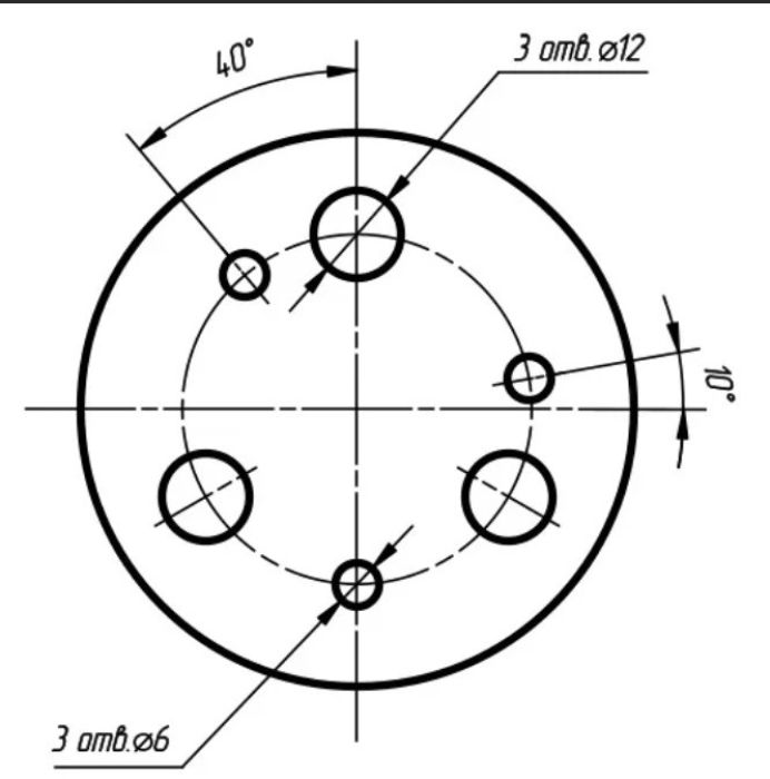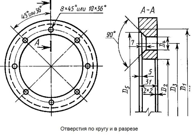 Размещение в круговом оформлении допустимо в случае, если того требует конструкция или сфера применения для повышения конечных характеристик создаваемого товара. При этом введена упрощенная система, на основании которой допускается отказ от дублирования повторяющихся точек на поверхности (то есть не потребуется отрисовка каждой части по-отдельности для достижения установленных правил) – достаточно будет использовать сокращение. Суть в том, что допустимо указание исключительно количество отверстий, которые требуется сформировать, а также размеры, на основании которых и производится получения высокой точности. При этом для каждого представленного кружочка, который и предполагает использование облегченной системы, требуется предоставление описания, чтобы то лицо, которое будет проводить расшифровку, не испытывало затруднений.