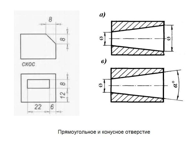 Есть определенный установленный норматив (ГОСТ) для создания разновидности – 2.320-82. Он используется в промышленном направлении, однако если отверстия конусного типа нашли применение в иных областях – требуется его соблюдение. Особенность – повышенные требования к информативности представленной вариации. Требуется произвести указание информации не только о том, какого размера основных стороны созданного отверстия, но и дополнительно – наклон, наличие дополнительных преобразований, изменения в стандартном оформлении при формировании продукции и т.д. Если человек упустит хоть один показатель – есть риск того, что готовая бумага будет низкого качества, следовательно, она не будет принята в соответствующем направлении.