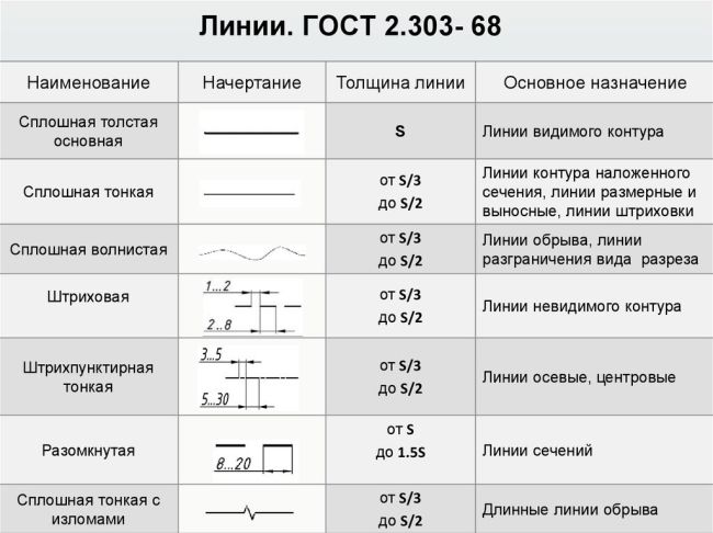Разные виды очертаний имеют уникальную толщину. Значение для любых типов показывается через значение S, обозначающее значение толщины основной толстой. Ниже по таблице вы можете изучить параметры, которые прописаны стандартом.
