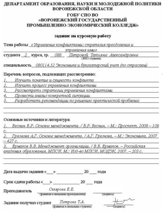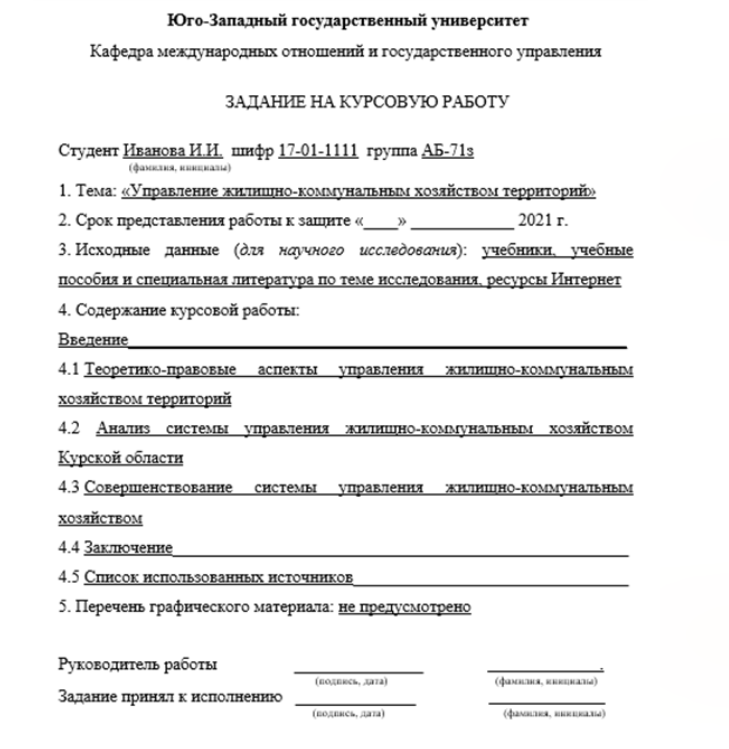 Задание на курсовую —важный документ, охватывающий основные требования для выполнения и оформления работы. Его выдают студентам и преподавателям. Учащимся он помогает не запутаться в источниках информации. Преподавателям он нужен, чтобы оценивать выполненные работы. Обычно бланки заданий раздаются в начале нового семестра, и в них уже указаны ключевые темы, которые следует осветить в исследовательской работе.