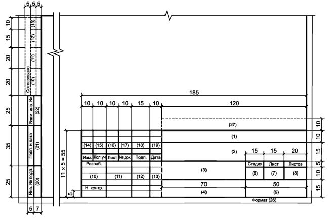 Согласно ГОСТ 2.104–2006, основная надпись располагается в правом нижнем углу формата чертежа или документа. Она состоит из 18 граф, в которые вносятся соответствующие данные в определенной последовательности.