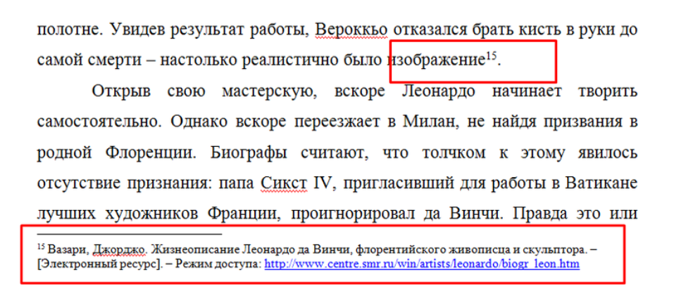 Сравниваем данный элемент со списком литературы. Сноски вносят дополнение к теоретическому или практическому материалу и повышают разнообразие текста. Они вмещают комментарии или примечания автора, которые необходимо было сделать.