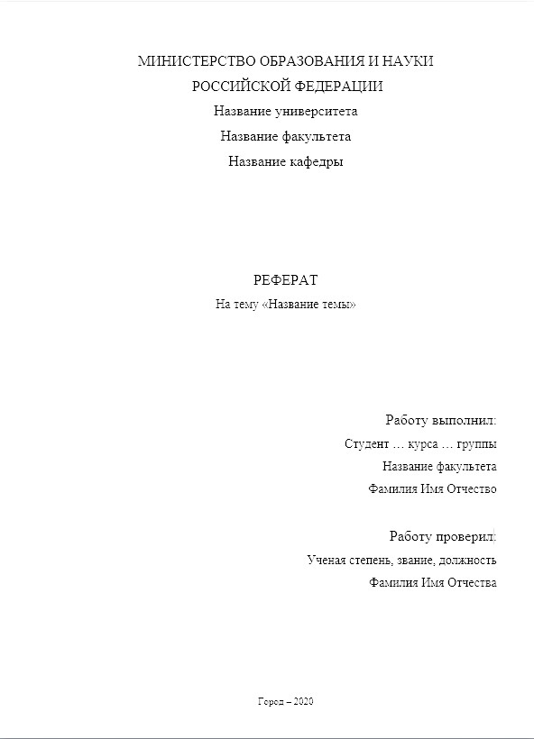 Студенческие и научные работы оформляются в соответствии с действующими правилами и стандартами. Титульный лист реферата является обязательной его частью, от правильности его составления в известной степени зависит оценка. Многие преподаватели предъявляют жесткие требования к содержанию и аккуратности его исполнения.