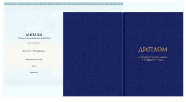 Диплом государственного образца о профессиональной переподготовке 2024 года имеет схожий дизайн с дипломами бакалавра, специалиста и магистра. На титульной странице присутствует наименование документа, а внутри содержатся такие сведения: