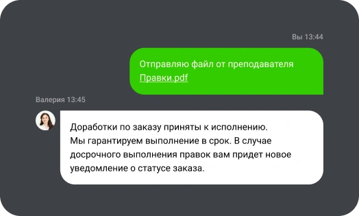 Мы подбираем из всех заявок на выполнение консультации подходящего исполнителя с учетом всех факторов, вы вносите предоплату. На любом этапе написания можно вносить коррективы — исполнители сервиса вносят правки в вкр бесплатно.